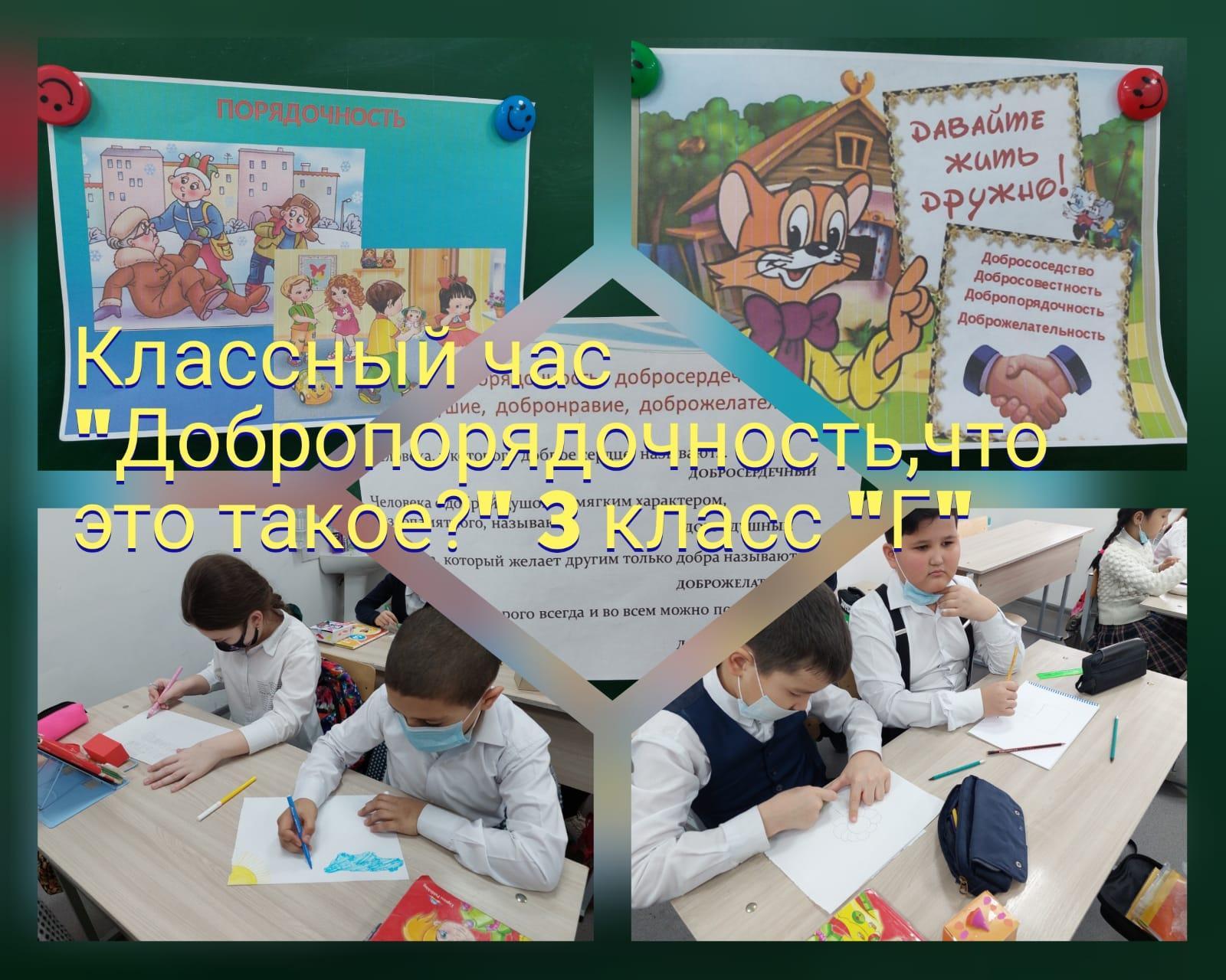 С целью формирования у учащихся представлений о доброте и милосердии, в 3 классе "Г" (кл.руководитель Сатвалдиева Н.И)был проведен классный час на тему: "Добропорядочность ,что это такое?".В ходе классного часа дети составили кластер, участвовали в викторине,пели песню "Дорогою добра", декламировали стихотворения о доброте и милосердии,о любви и дружбе.