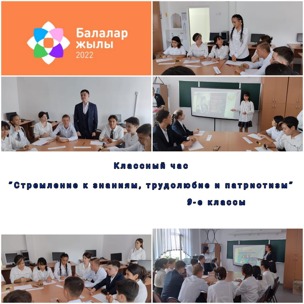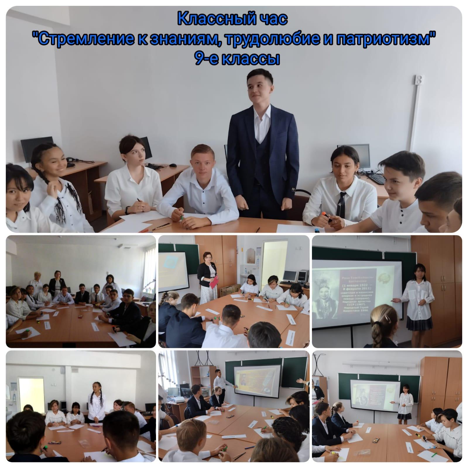 1 сентября 2022 года, праздник "День знаний". В средней школе № 2 города Тараз был проведен единый классный час на тему: "Стремление к знаниям, трудолюбие и патриотизм". Цель данного мероприятия: показать учащимся взаимосвязь знаний, трудолюбия и патриотизма, их важное значение для каждого ученика; формирование гражданственности, ответственности за судьбу своей Родины. Обучающиеся 9- ых классов приняли активное участие в проведении классного часа. Ребята рассказывали о выдающихся личностях Казахстана ( В. Алтынсарине, М. Ауэзове, Р. Баглановой, Д.А.Кунаеве), читали стихотворения казахстанских поэтов о труде, Родине, природе родного края. Подведением итогов классного мероприятия послужили слова учителя:" Любите Родину, ребята, и гордитесь тем, что вы её граждане! Её будущее - в ваших руках, и она будет такой, какой сделаете её ВЫ!"