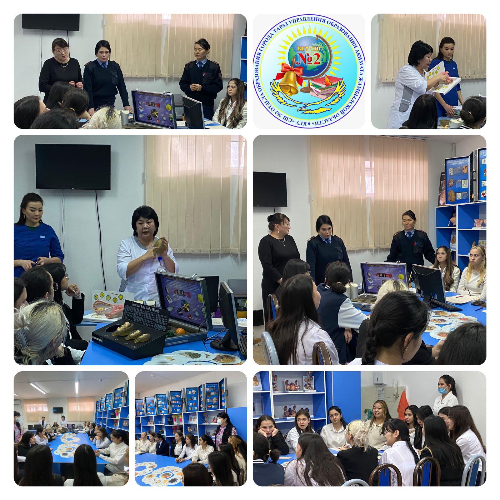 В рамках проведения в школе #2 Месячника по профилактике правонарушений "Законы знай и соблюдай",реализации плана работы клуба"Кыз Жибек", нравственно-полового воспитания девушек,формирования понятия женственности,самооценки своего поведения,ответственного отношения к своему здоровью,зам. директора по ВР :Щелоковой Т.А,Смадиловой А.Ж,психологом Тансык А.С. ,социологом Дильдебаевой Д.Б.,сотрудниками УИП ГЮП ОМПС УП г.Тараз:капитаном полиции Н.Узенбаевой,ст.лейтенантом М.Амановой совместно с членами клуба "Кыз Жибек",девушками 11-х классов и специалистами МЦЗ "Жигер" поликлиники "ZHANUJA" была проведена встреча- тренинг на тему:"Социально-гигиенические аспекты полового воспитания".В ходе встречи с учащимися были обсуждены такие темы, как: "Гигиена тела","Репродуктивное здоровье.Гигиена","Профилактика ранней беременности',освещены медицинские,психологические,социальные и юридические аспекты ранних половых связей и их последствий.
