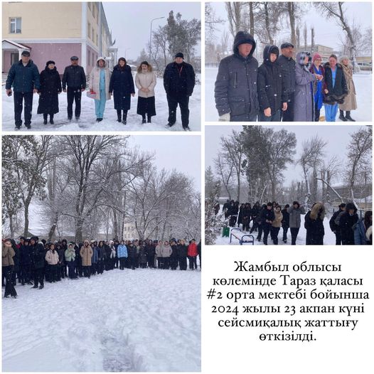 Жамбыл облысы көлемінде Тараз қаласы #2 орта мектебі бойынша 2024 жылы 23 акпан күні сейсмиқалық жаттығу өткізілді. Дабыл жуйесі косылып 23 ақпан күні сагат 11-де ғимараттан барлық оқушыларды, мектеп қызметкерлерін, асхана қызметкерлері шығарылды.