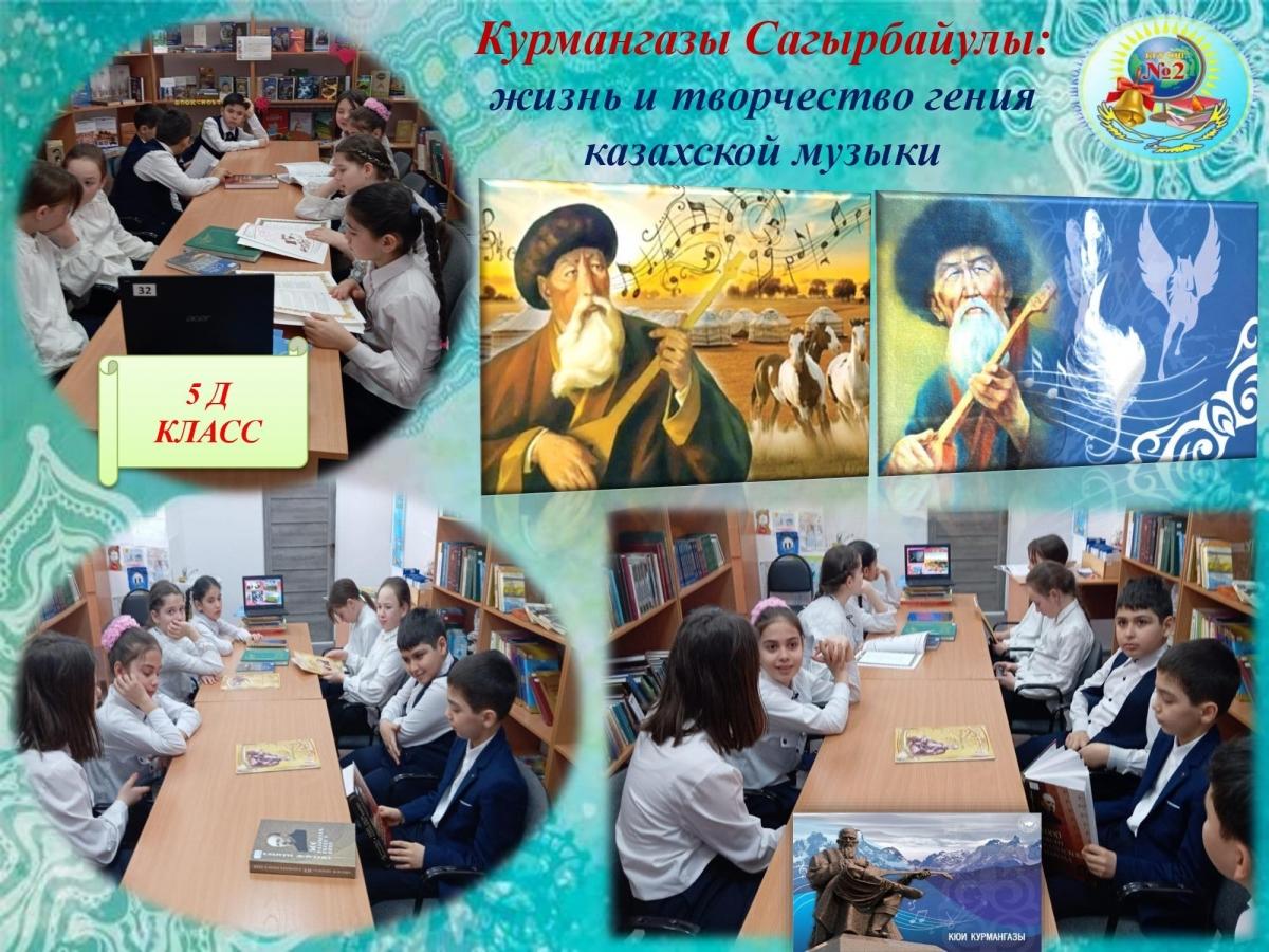 Библиотека КГУ СШ №2 провела библиотечный урок на тему: Курмангазы Сагырбайулы: жизнь и творчество гения казахской музыки. Участники : 5 Д класс ( классный руководитель: Игамбердиева Д.Т.). Цель: формировать знания о творчестве Курмангазы; развивать интерес к игре на домбре; понимать содержание күйев; воспитывать уважение, гордость к сыну народа – Курмангазы; любовь и интерес к национальной музыке. Вниманию учащихся была представлена информация о великом казахском народном композиторе Курмангазы Сагырбайулы. Дети окунулись в мир искусства и творчества того времени. Прослушали записи күев. Особенно понравился күй «Адай», где Курмангазы отображает энергию народа, мощь, ее неисчерпаемый героизм.