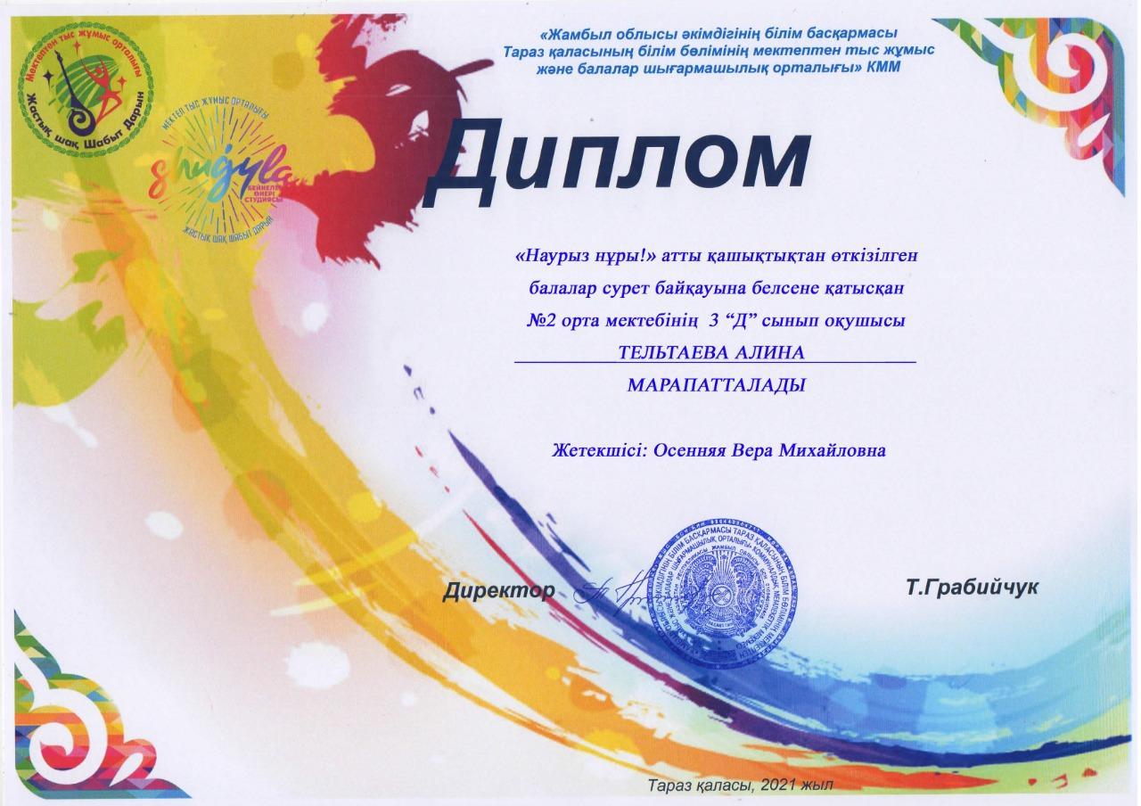 С целью воспитания интереса и уважения к праздникам и традициям родной страны, а также развитию общей культуры, воспитания патриотизма, ученики 3 класса "Д " и 2 класса "Е" приняли активное участие в творческом конкурсе рисунков "Наурыз нұры!" Классный руководитель: Осенняя В.М.