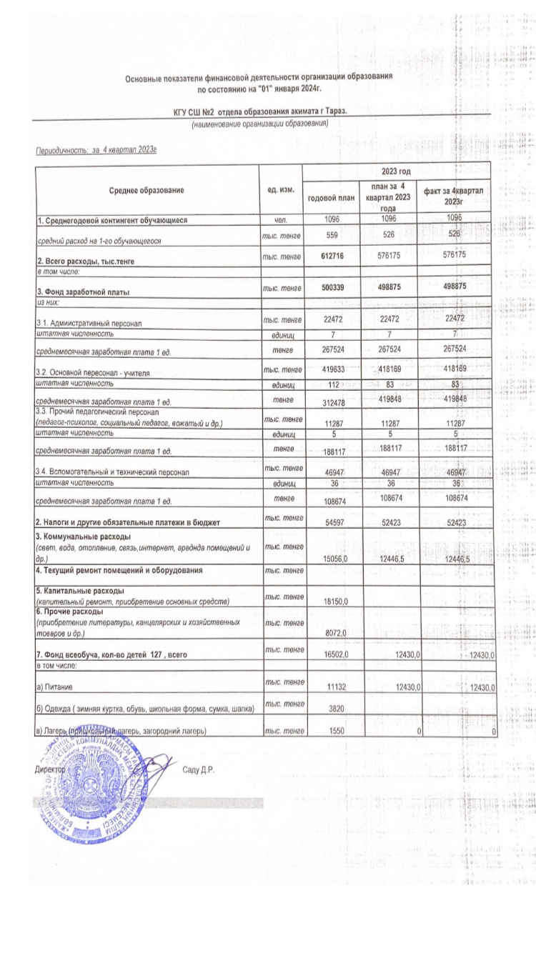 СШ №2 » Ашық бюджет » Основные показатели финансовой деятельности организации образования по состоянию на «01» января 2024г