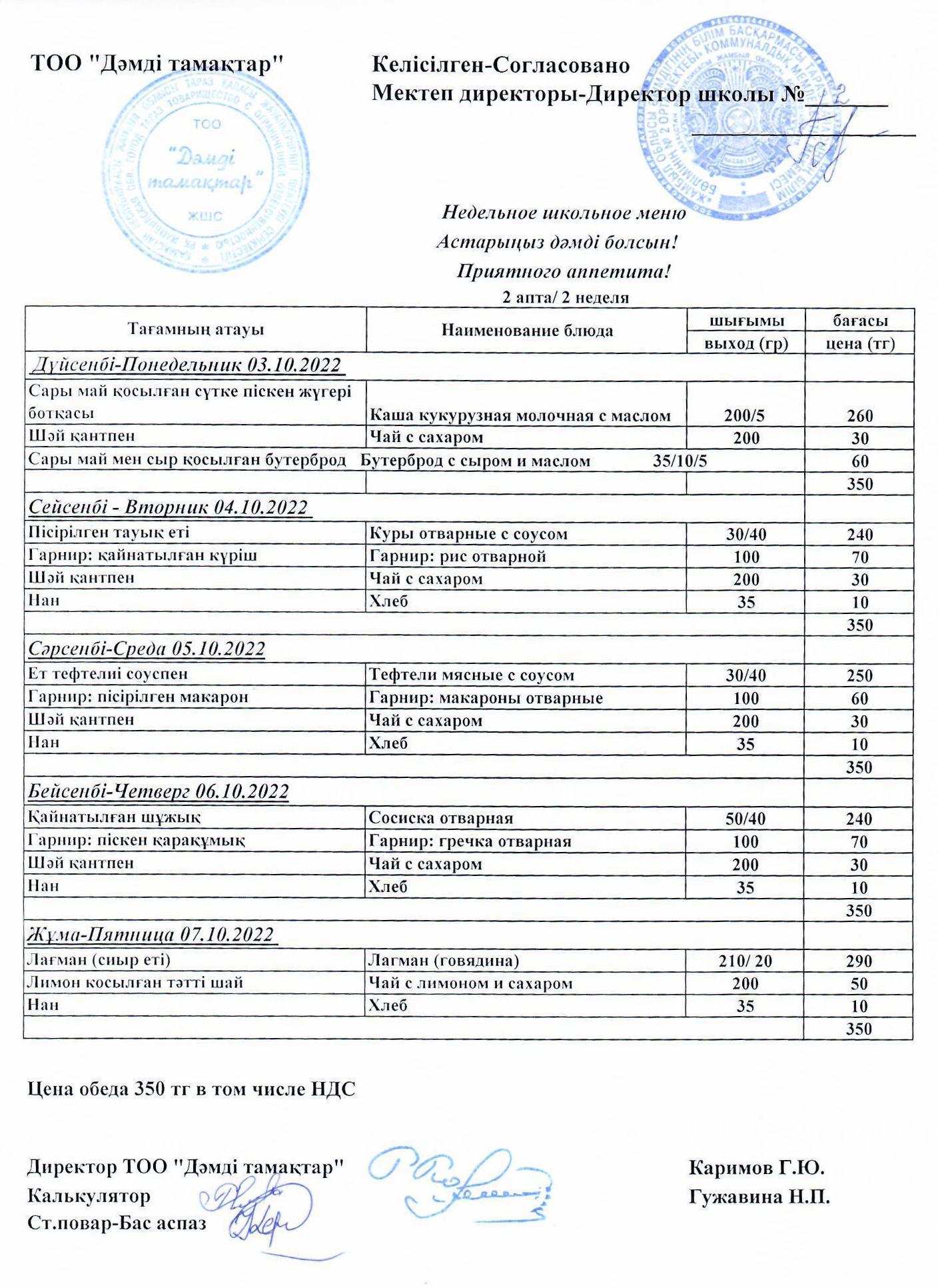 Недельное школьное меню 2 неделя (03.10.-07.10.22) » СШ №2