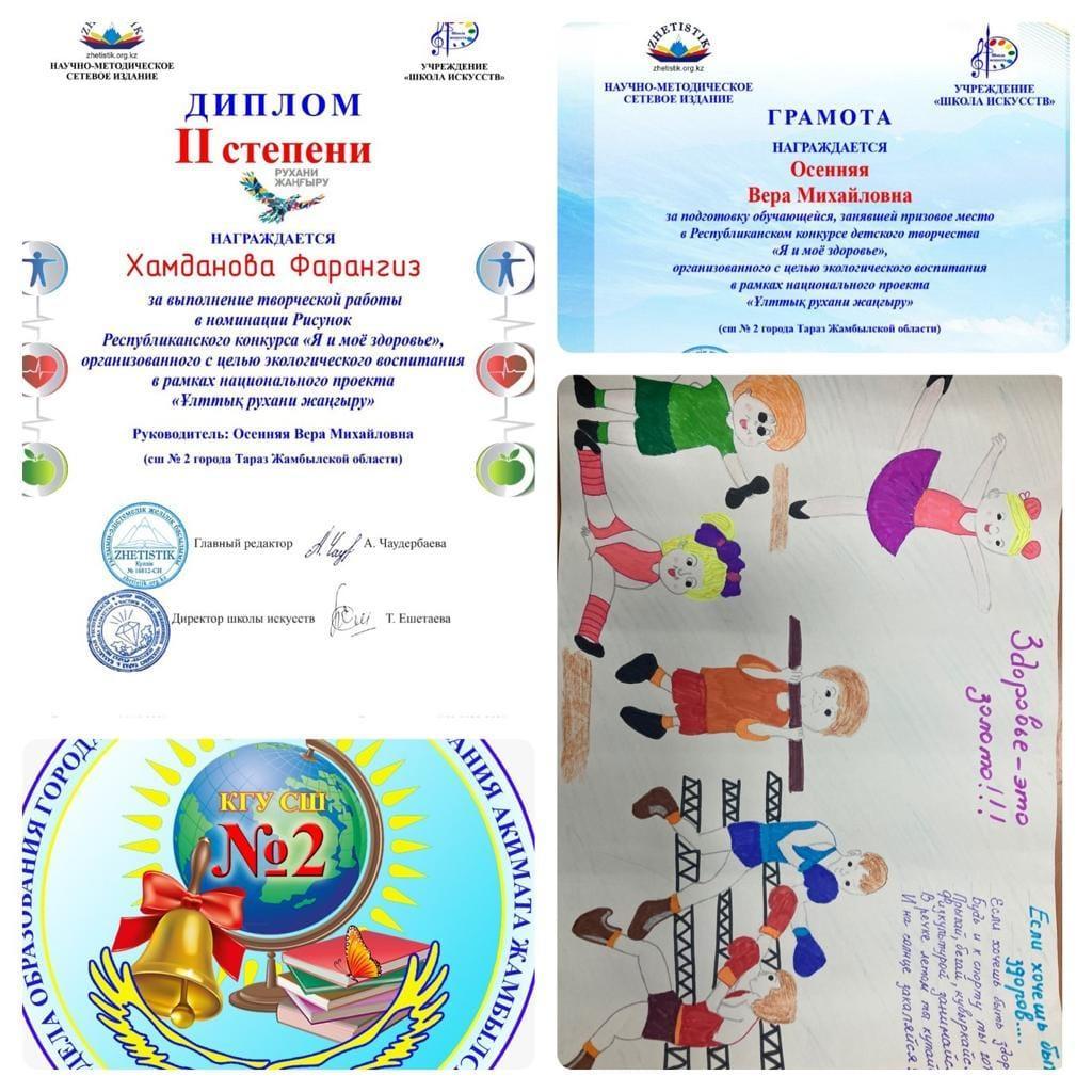С целью экологического воспитания в рамках национального проекта ,,Ұлттық рухани жаңғыру’’ ученица 3’’Е’’ класса сш 2 ХАМДАНОВА ФАРАНГИЗ награждена дипломом 2 степени за активное участие в Республиканском конкурсе ,,Я и моё здоровье‘’ в номинации Рисунок. Руководитель: Осенняя В. М.