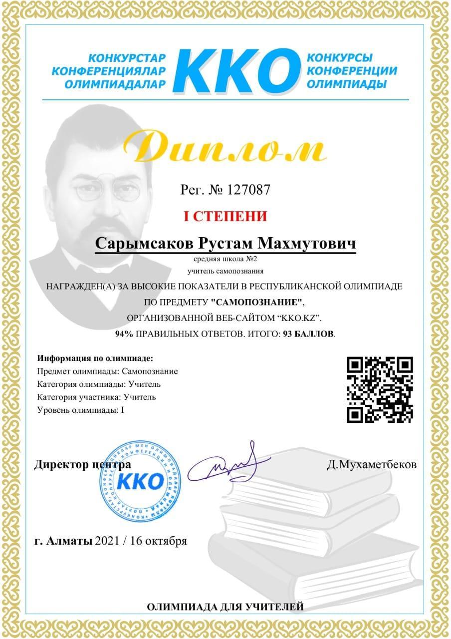 Диплом 1 степени Сарымсаков Р. М. » СШ №2