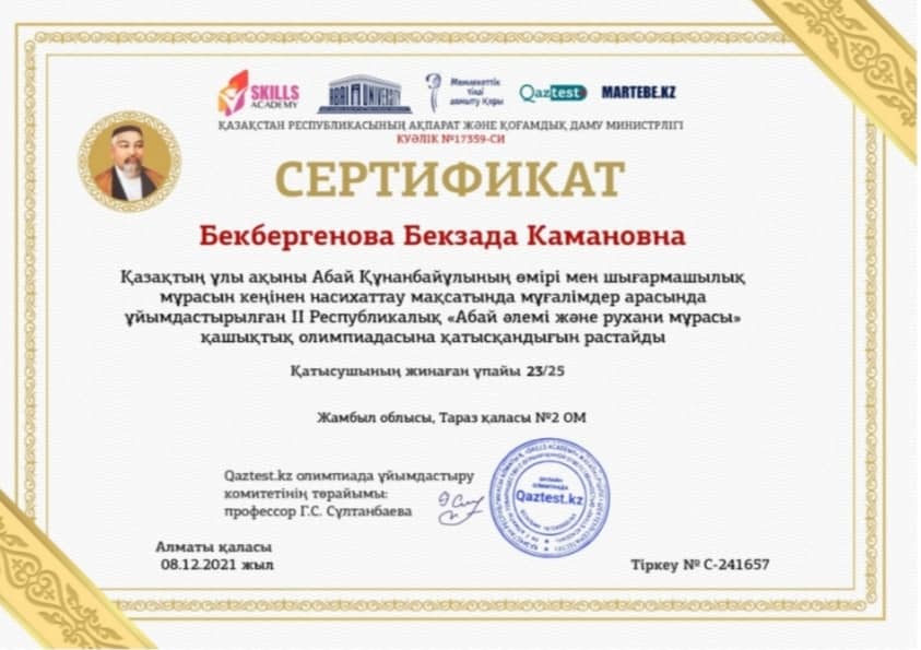 Сертификат Бекбергенова Бекзада