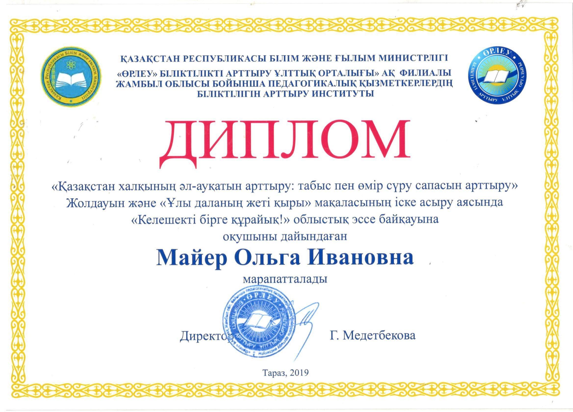 Диплом Майер Ольги Ивановны » СШ №2