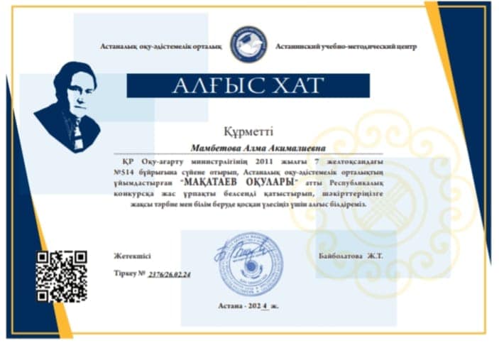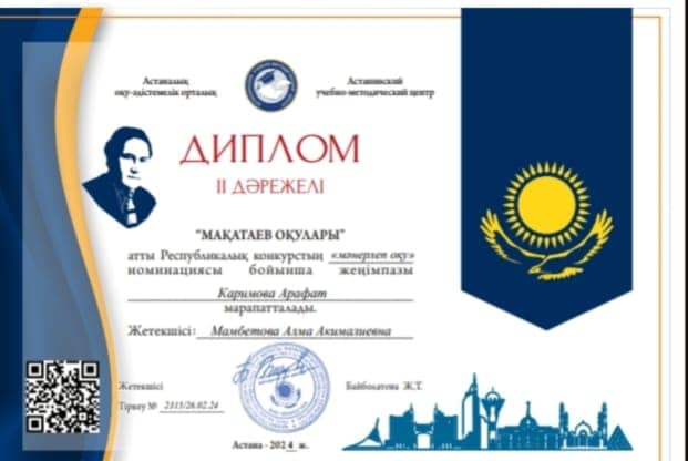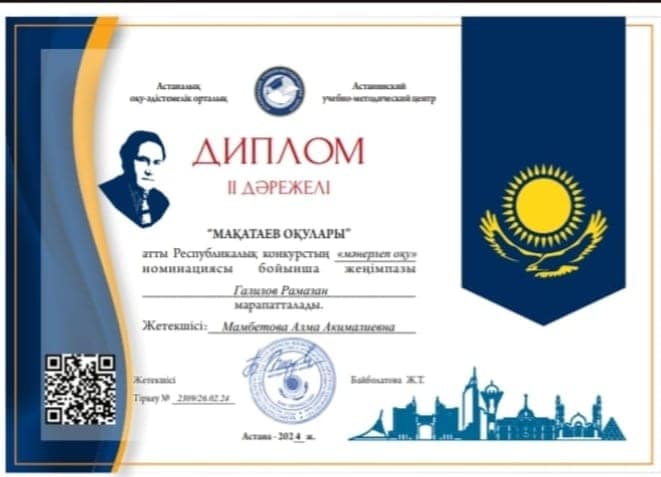 Республикалық "Мақатаев оқулары" конкурсында мәнерлеп оқу номинациясы бойынша #2орта мектебінің оқушылары Омаралина Шадия І дәрежелі дипломмен, Каримова Арафат, Дархан Инжу, Кабышева Самал, Гализов Рамазан ІІ дәрежелі дипломдармен, Джалаладинов Юсуф ІІІ дәрежелі дипломмен, жетекшілері Мамбетова Алма Акималиевна Алғыс хатпен марапатталды. Жеңімпаз оқушыларымыз бен жетекші ұстазымызды құттықтаймыз!