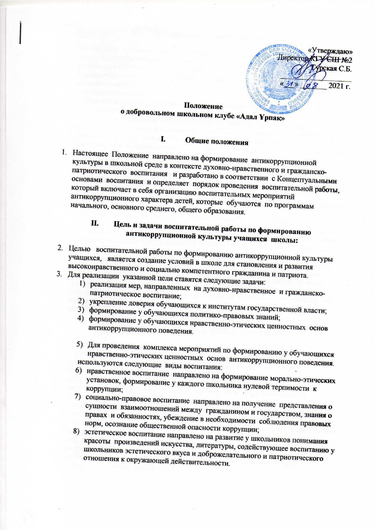 Положение о добровольном школьном клубе "Адал Ұрпақ" » СШ №2