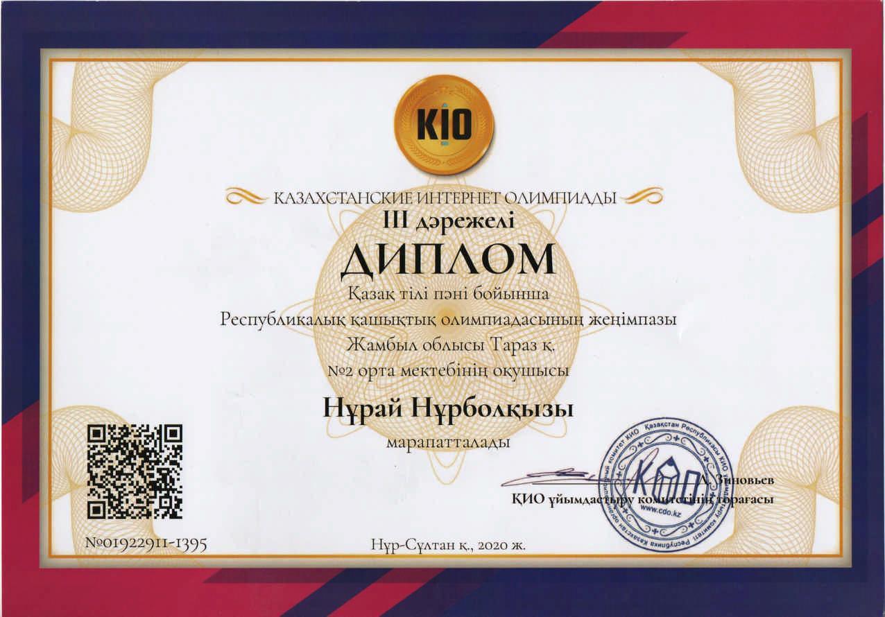 Диплом КИО, Нурай Нурболкызы » СШ №2
