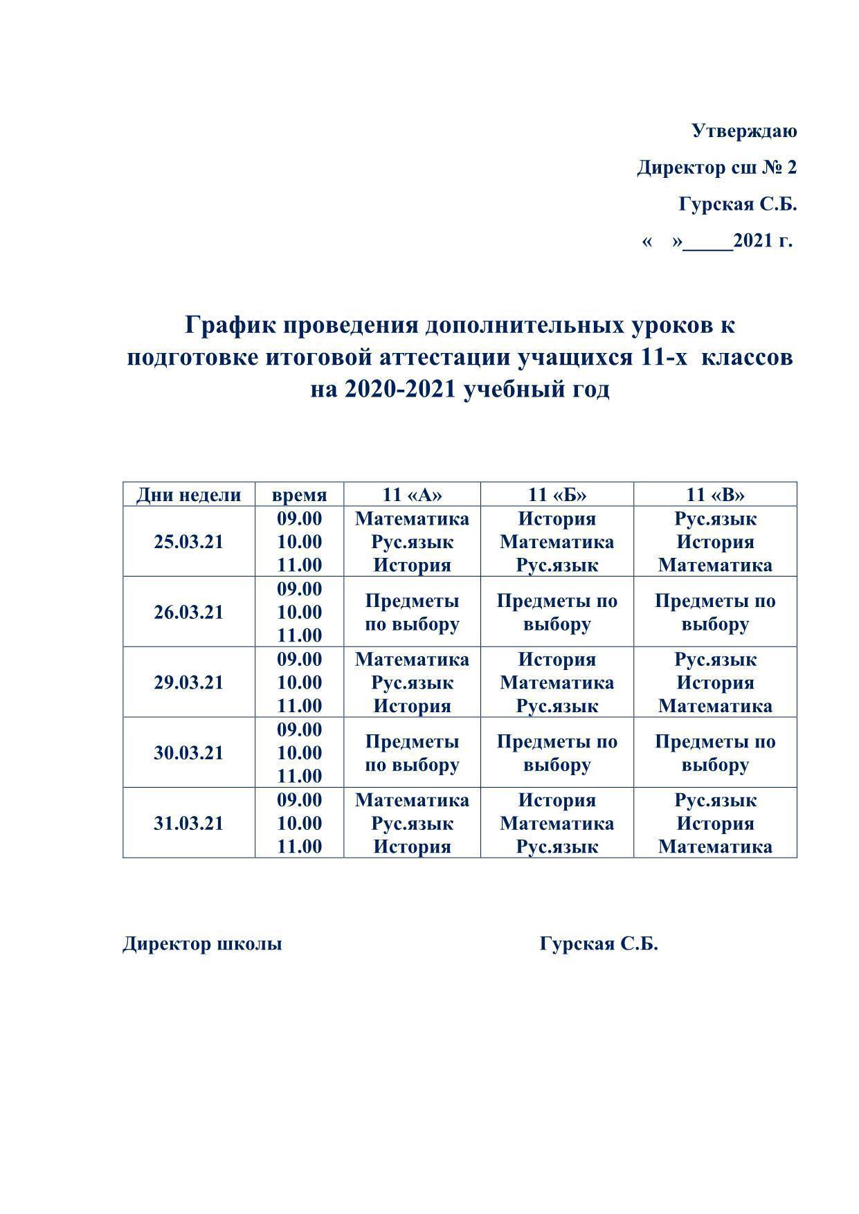График проведения дополнительных уроков к подготовке итоговой аттестации учащихся 11-х классов на 2020-2021 учебный год » СШ №2