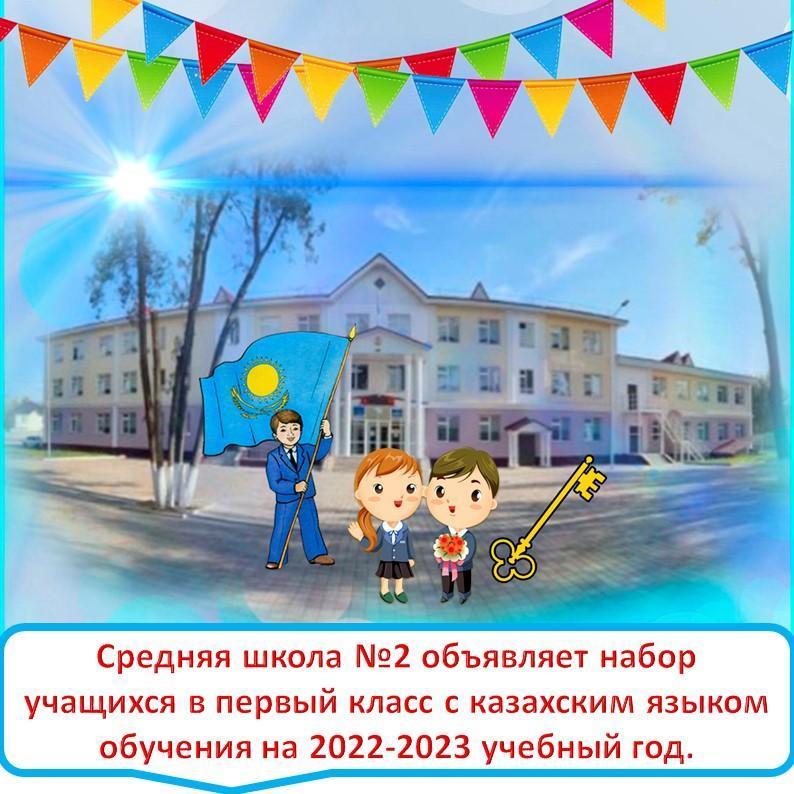 Средняя школа №2 объявляет набор учащихся в первый класс с казахским языком обучения на 2022-2023 учебный год.