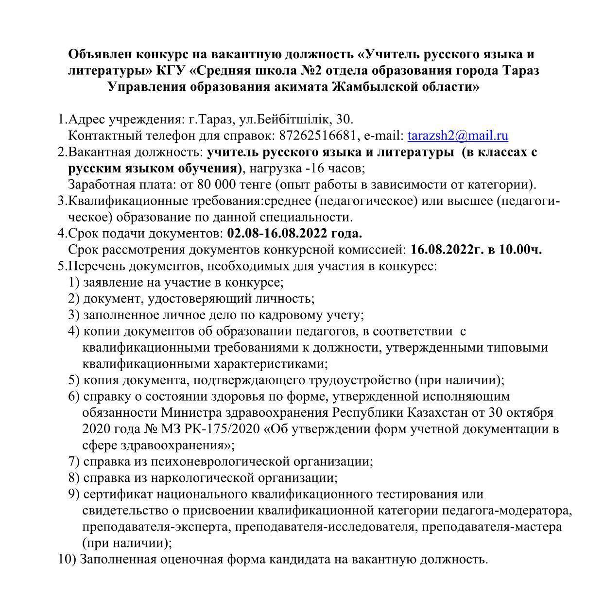 СШ №2 » Ақпарат » Объявлен конкурс на вакантную должность «Учитель русского языка и литературы»