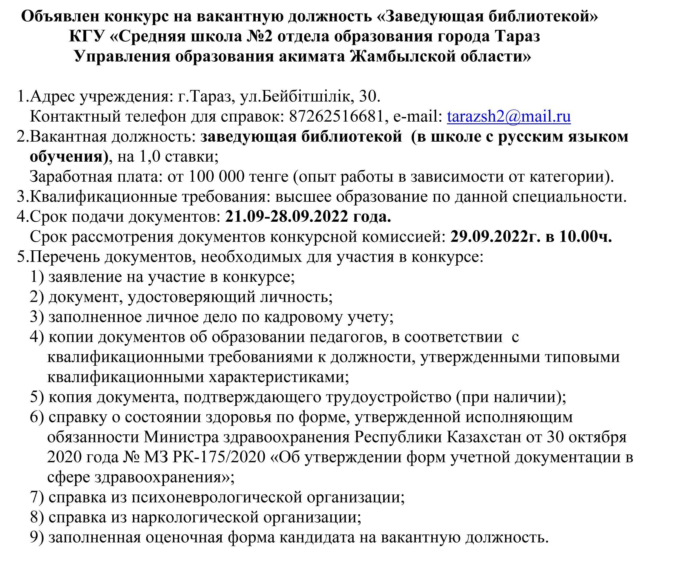 Объявлен конкурс на вакантную должность «Заведующая библиотекой» » СШ №2