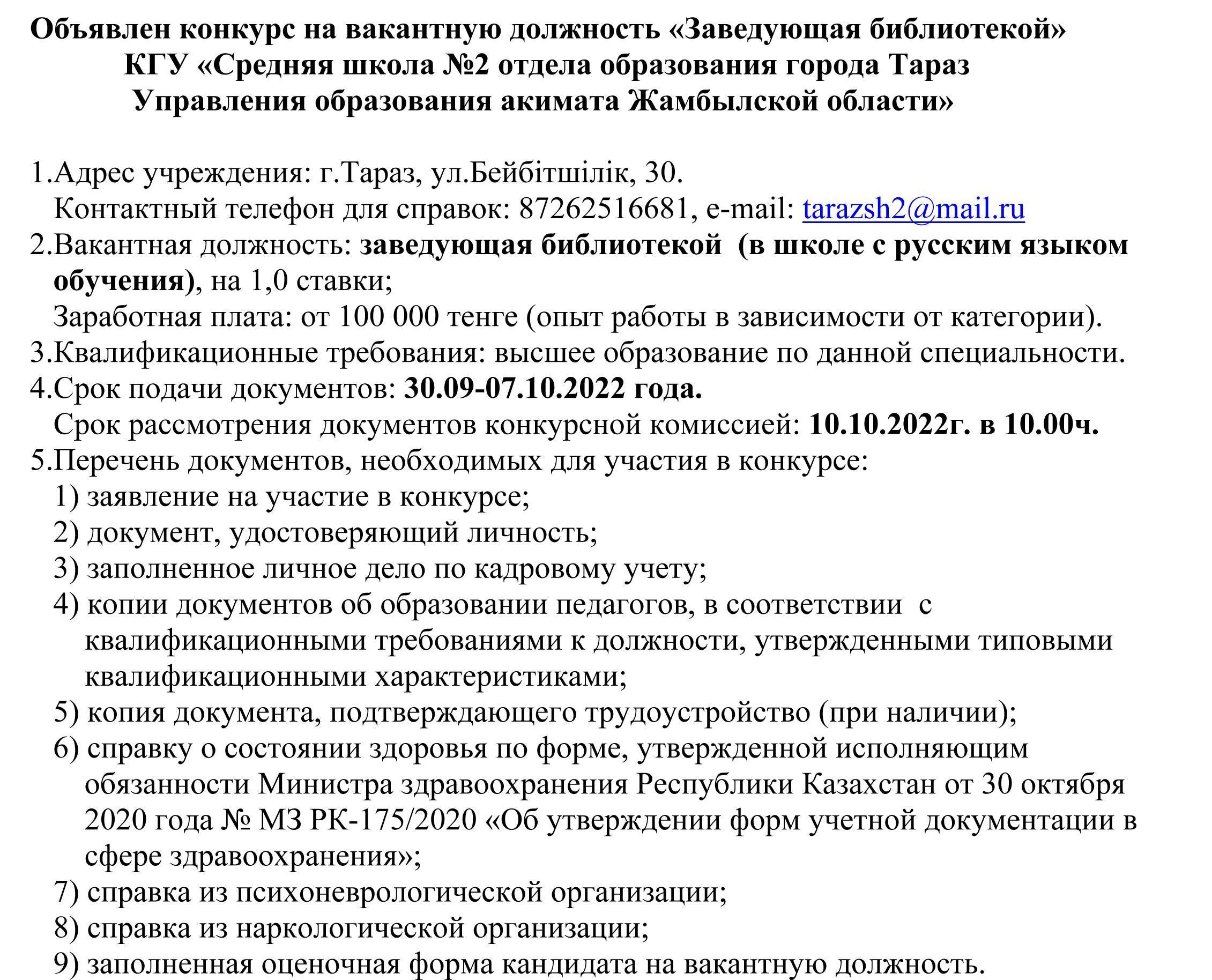 Объявлен конкурс на вакантную должность «Заведующая библиотекой» » СШ №2
