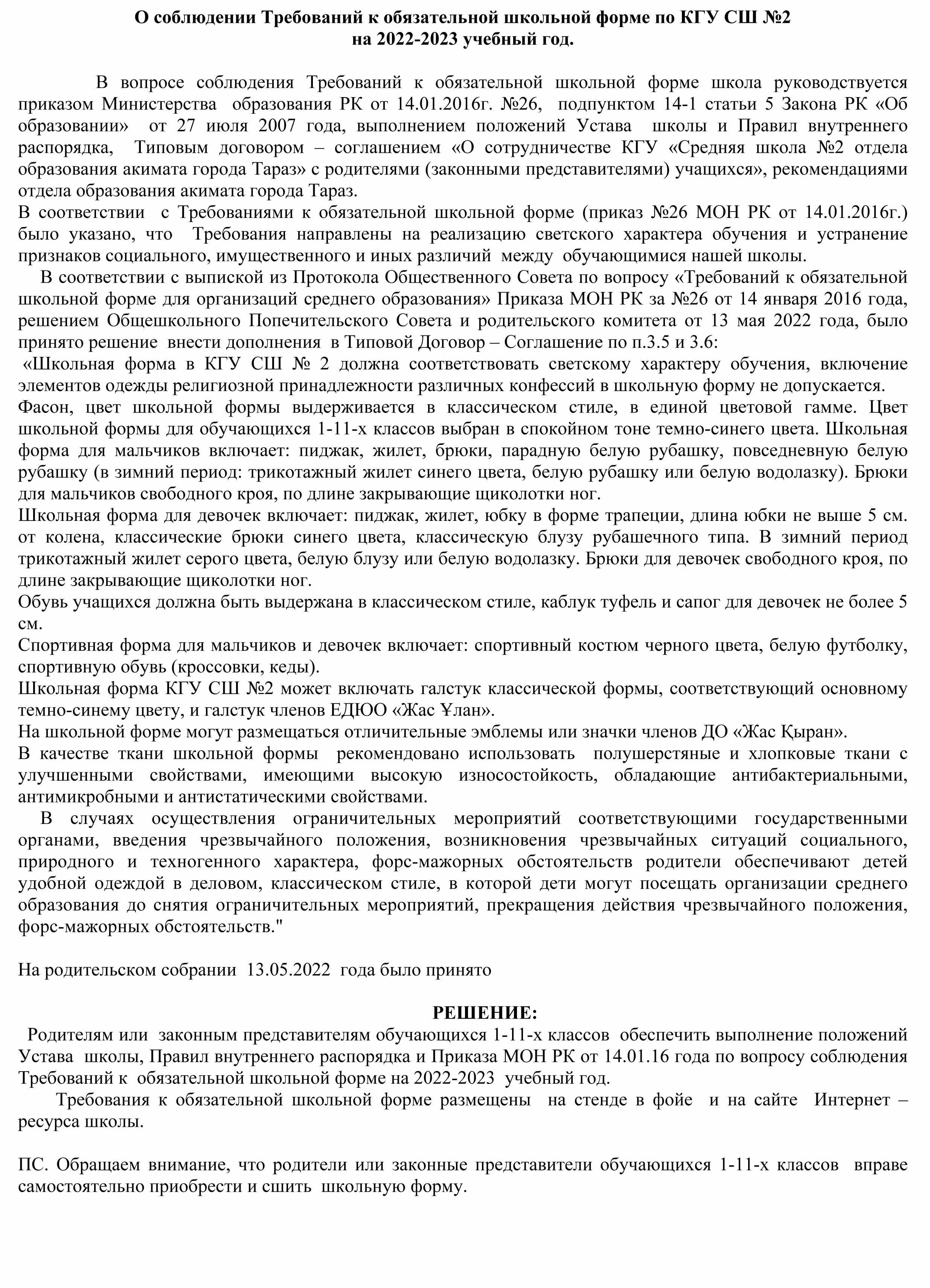 О соблюдении Требований к обязательной школьной форме по КГУ СШ №2 на 2022-2023 учебный год. » СШ №2
