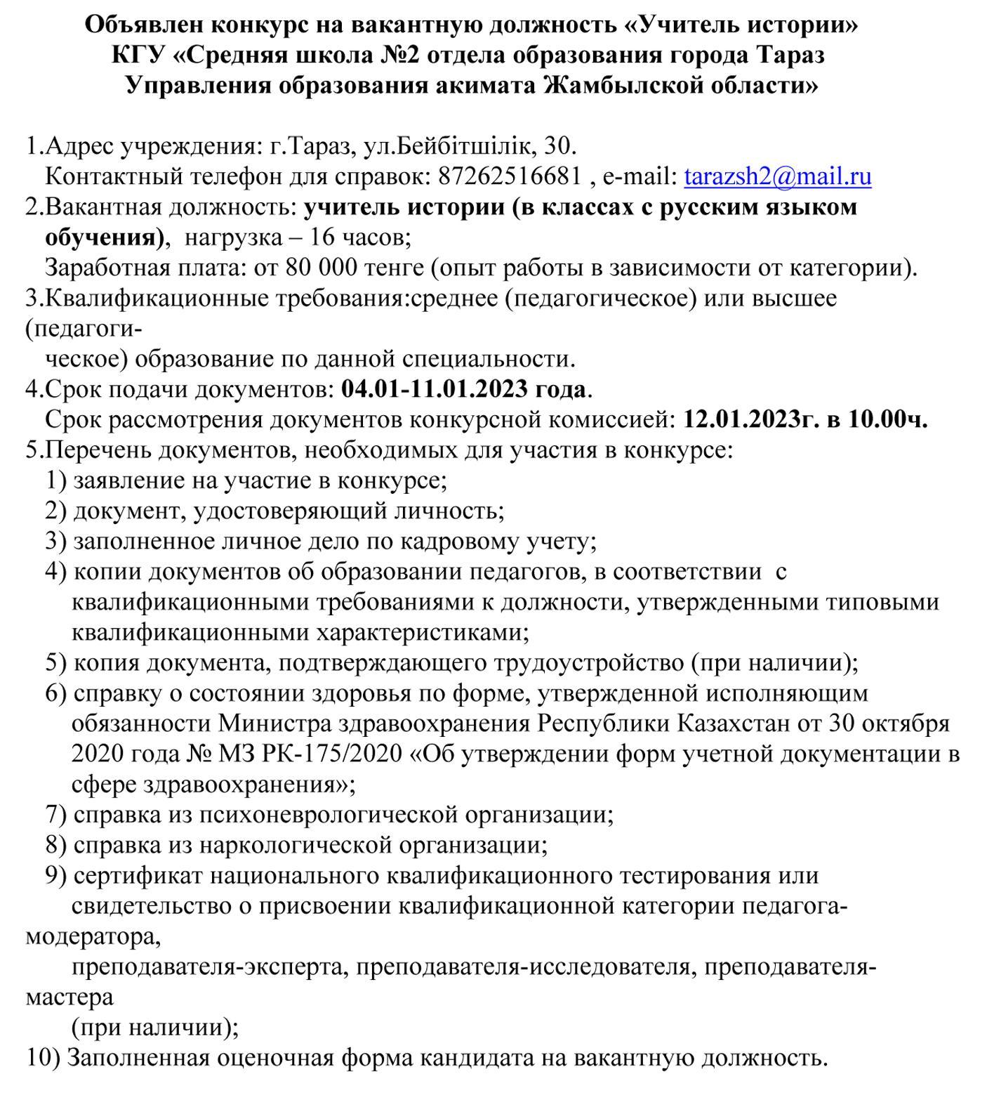 2. Наименование вакантной должности: Учитель истории (в классах с русским языком обучения), нагрузка – 16 часов. Заработная плата: от 100 000 теңге (в зависимости от стажа работы, квалификационной категории).
