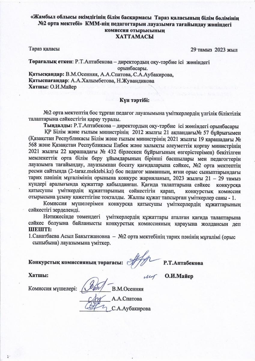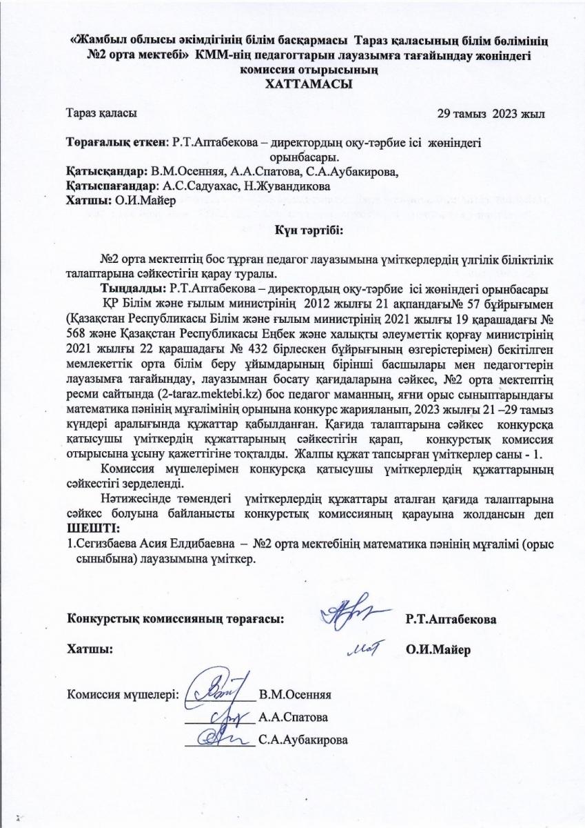 Педагогтарын лауазымға тағайындау жөніндегі комиссия отырысының ХАТТАМАСЫ » СШ №2