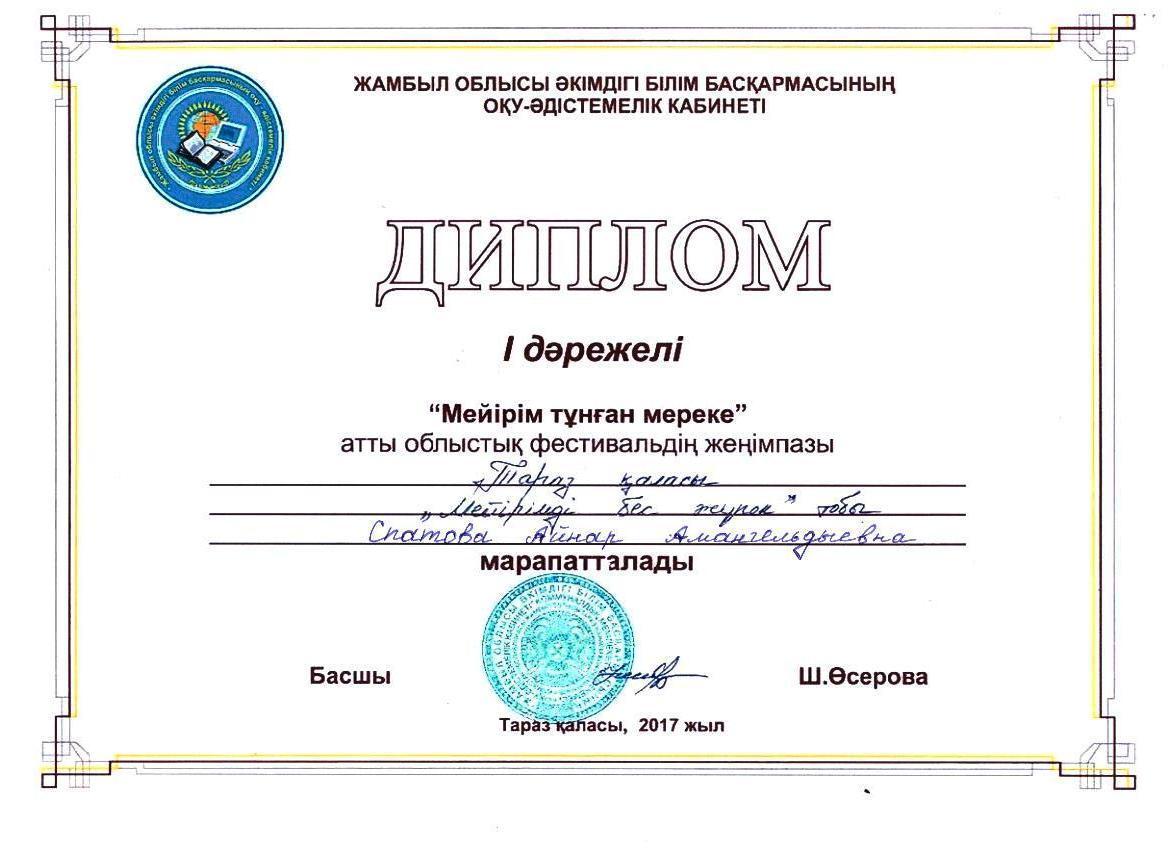 Победители областного фестиваля среди учителей самопознания «Мейірім тұнған мереке» 19. 05. 2017 г.