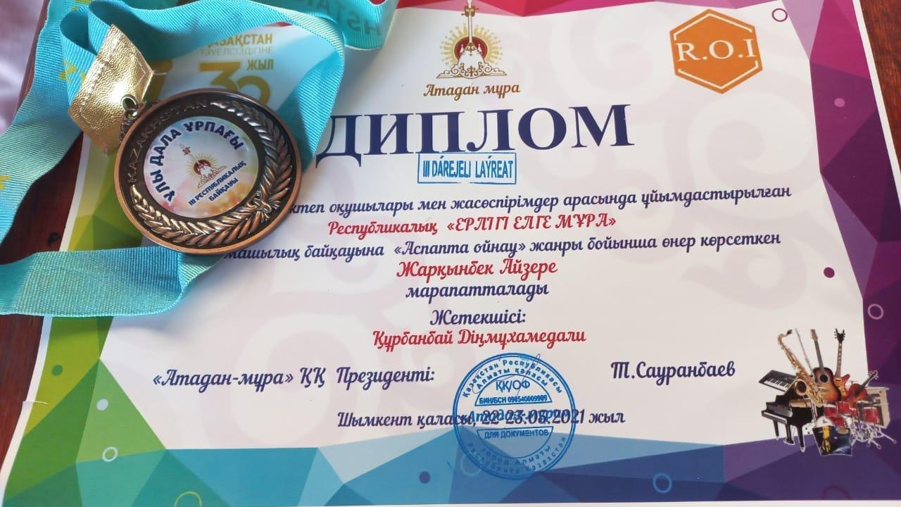 24 мамыр 2021 Творческих тебе побед, Айзере! Мы тобой гордимся! Наша талантливая звёздочка, ученица 2"А" класса Жаркынбек Айзере (Кл.рук. Крюкова Л.В), стала лауреатом Республиканского музыкального конкурса"Ерлігі Елге Мұра" в номинации"Аспапта ойнау."