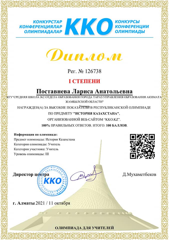 Диплом 1 степени Поставнева Л. А. » СШ №2