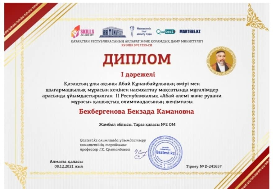 Диплом - Бекбергенова Бекзада » СШ №2