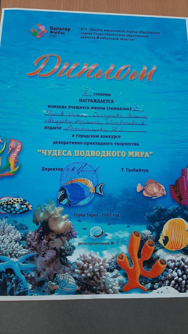 Поздравляем творческую группу учащихся, которые достойно представили нашу школу на городском конкурсе декоративно-прикладного творчества "Чудеса подводного мира"и заняли 2 место!