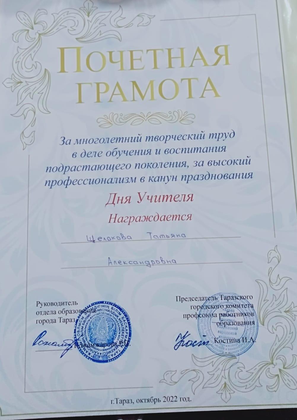 Почетная грамота - Щелокова Т. А. » СШ №2