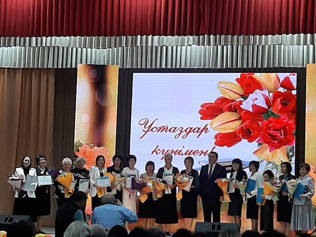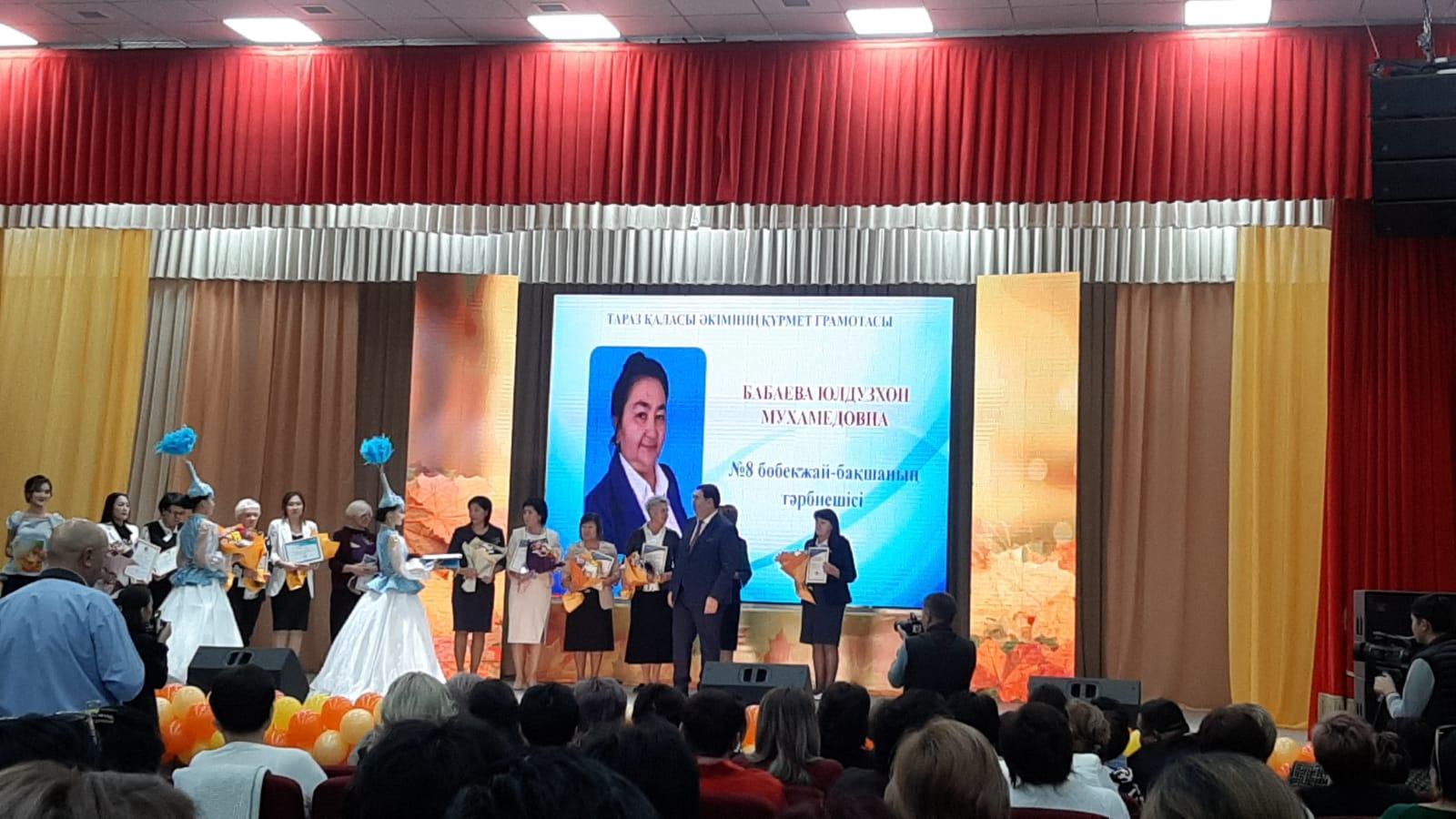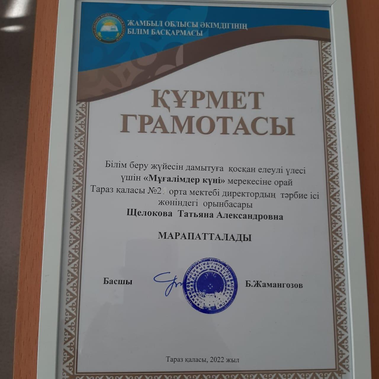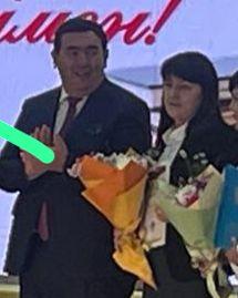 Вручение грамоты акимом города Тараз Орынбековым Б.А. заместителю директора по ВР Щелоковой Т.А от Жамбылского областного управления образования.
