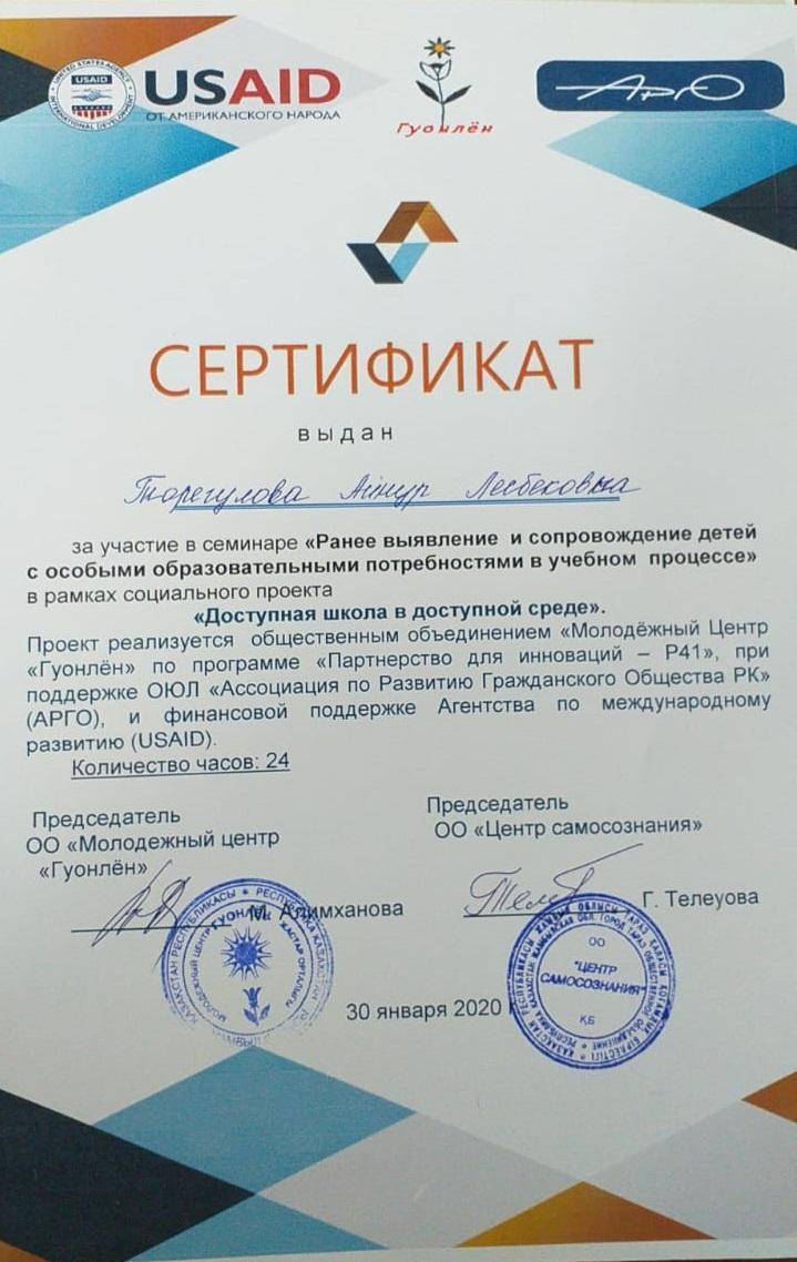 Сертификат. Торегулова Айнур Лесбековна » СШ №2