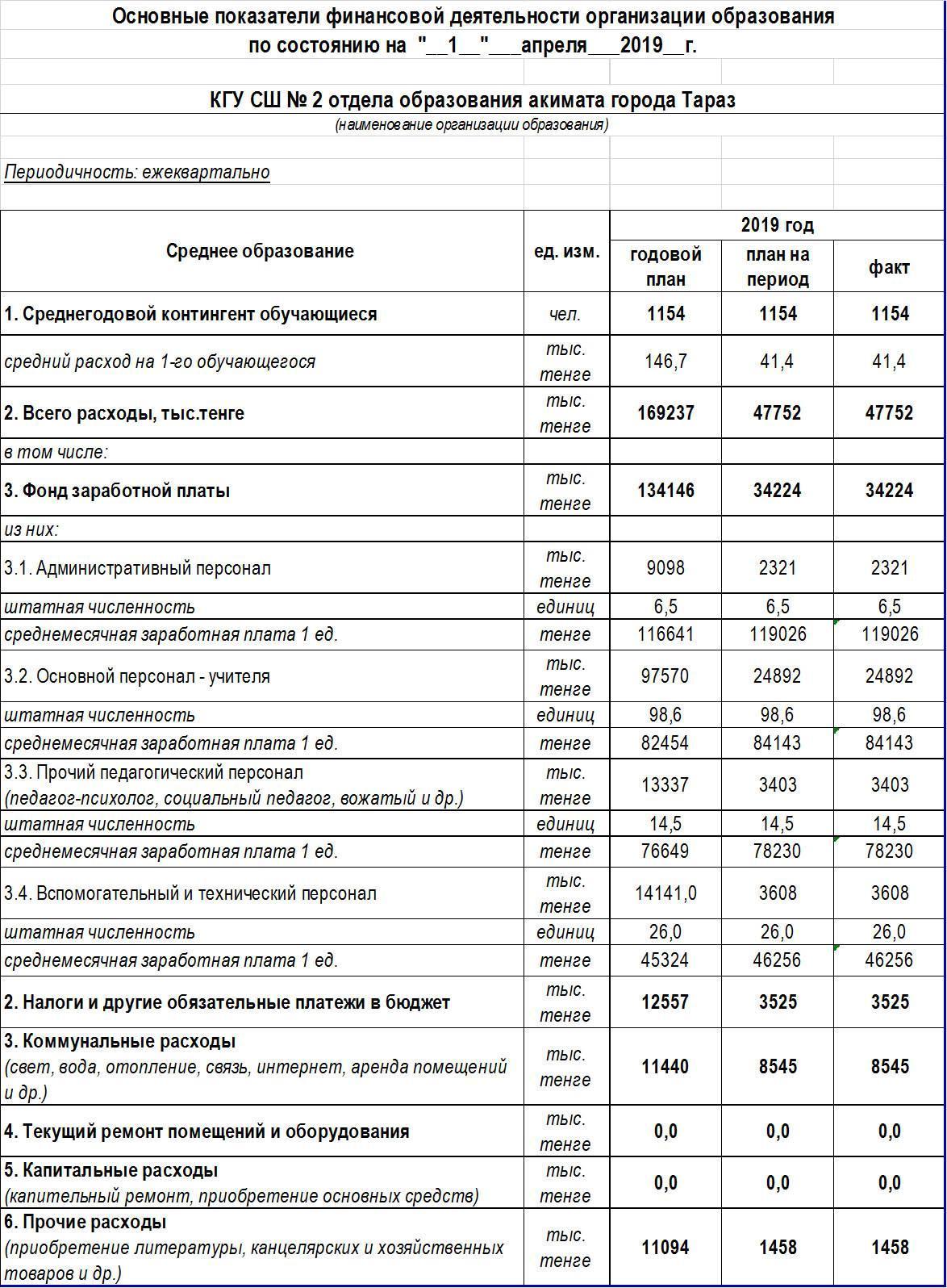 Основные показатели финансовой деятельности организации образования 01.04.2019 » СШ №2