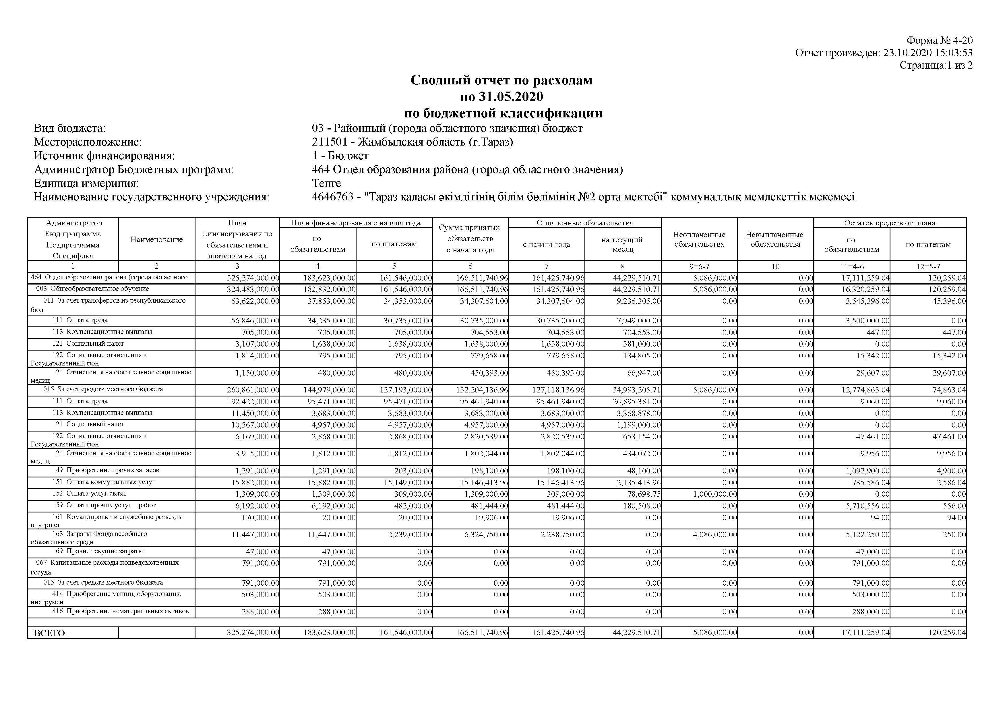 Сводный отчет по расходам по 31.05.2020 по бюджетной классификации » СШ №2