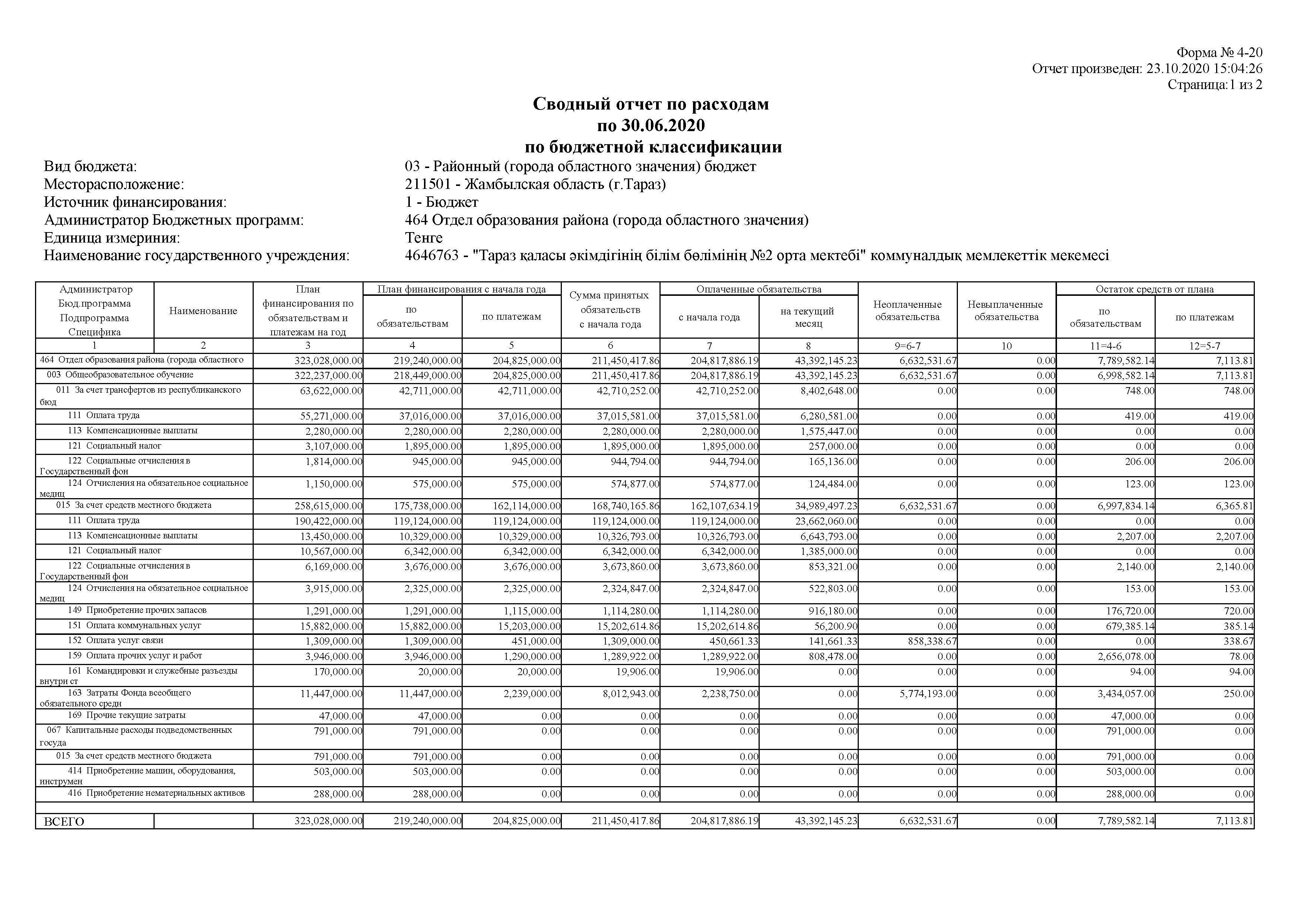 Сводный отчет по расходам по 30.06.2020 по бюджетной классификации » СШ №2