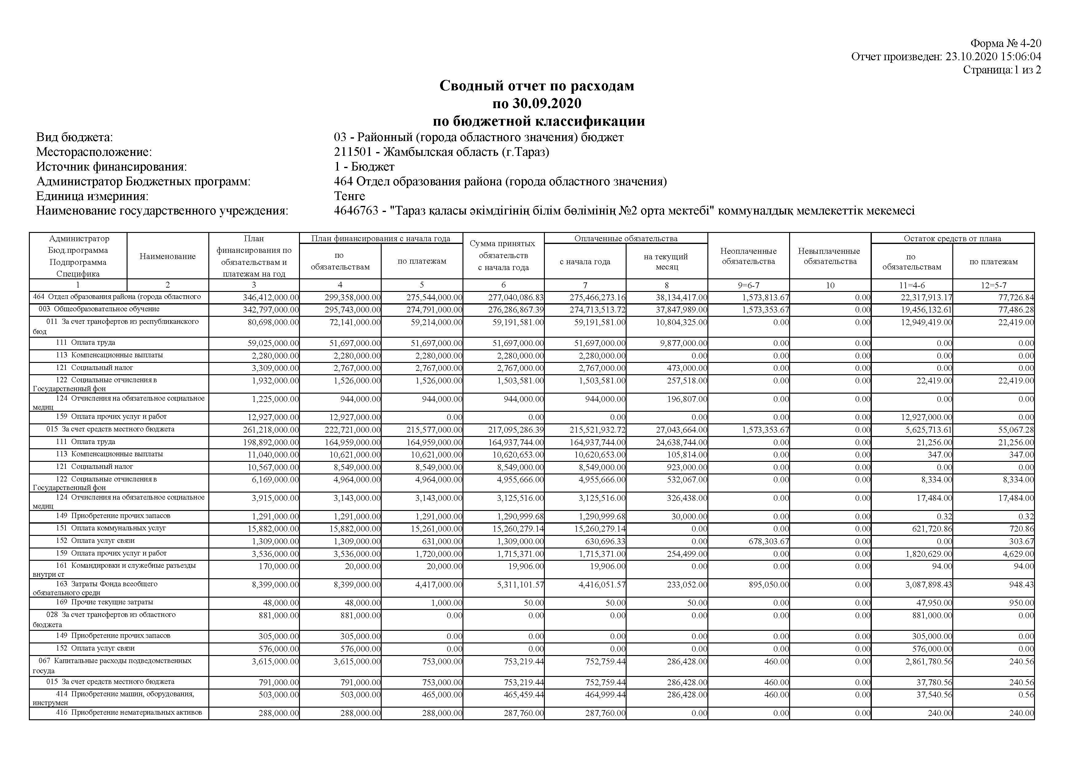 Сводный отчет по расходам по 30.09.2020 по бюджетной классификации » СШ №2