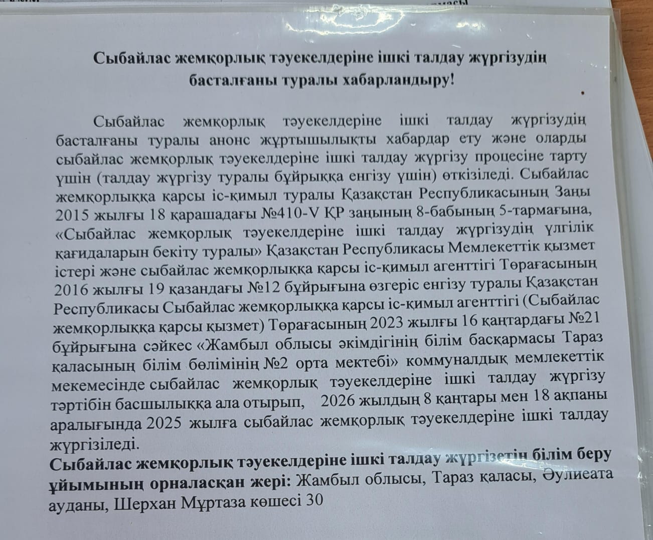 05 қаңтар 2026 0 1 2 3 4 5 Сыбайлас жемқорлық тәуекелдеріне ішкі талдау жүргізудің басталғаны туралы хабарландыру!