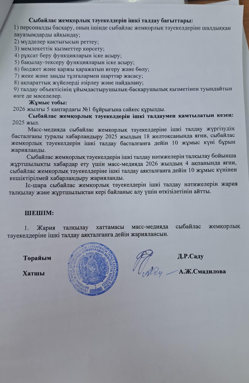 » » » Сыбайлас жемқорлық тәуекелдерін ішкі талдау нәтижелерін жария талқылау ХАТТАМАСЫ