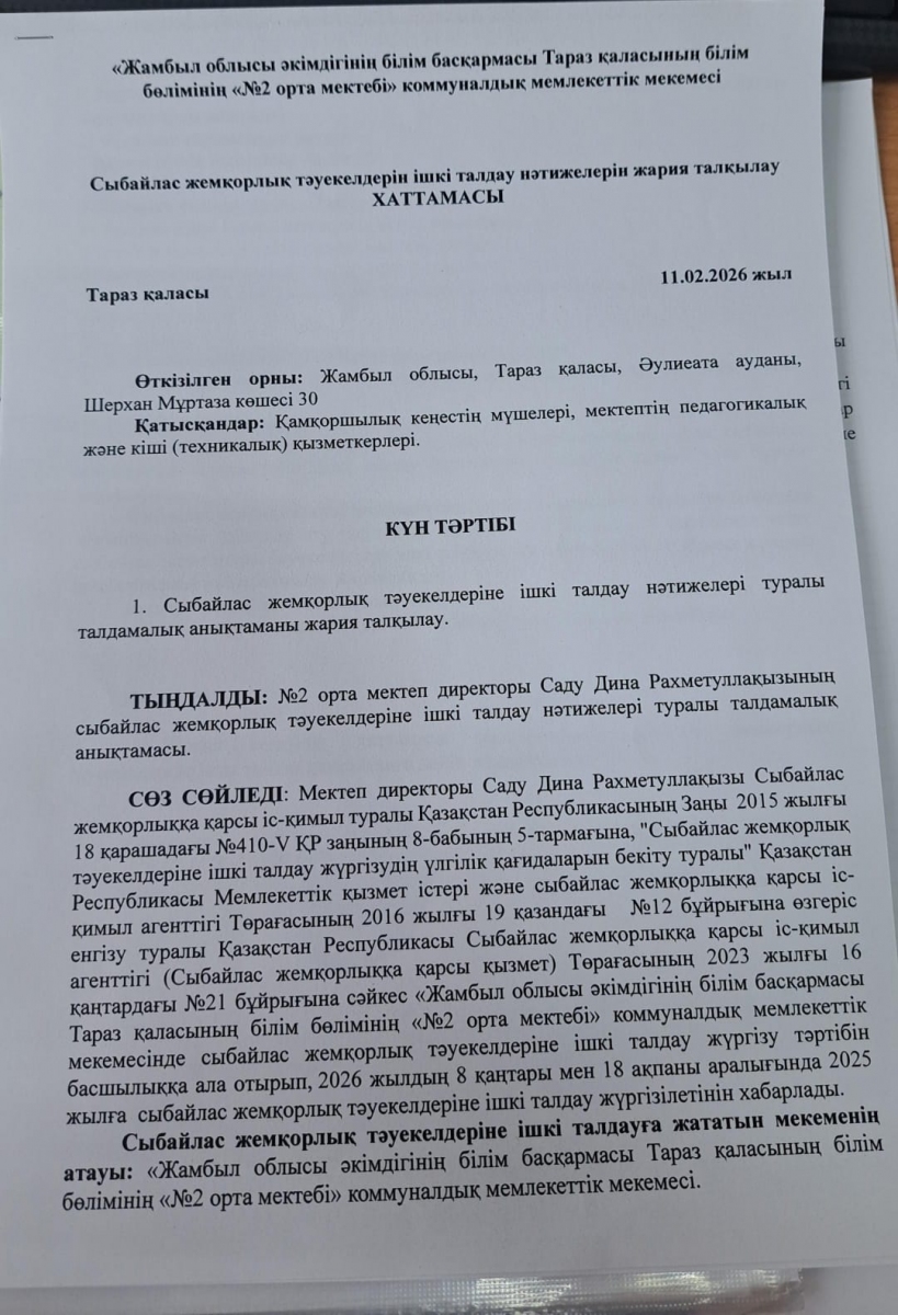 Сыбайлас жемқорлық тәуекелдерін ішкі талдау нәтижелерін жария талқылау ХАТТАМАСЫ » СШ №2