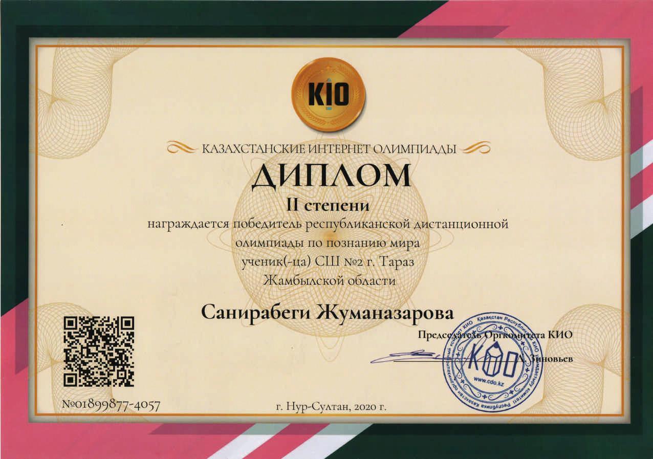 Диплом КИО, Санирабеги Жуманазарова » СШ №2