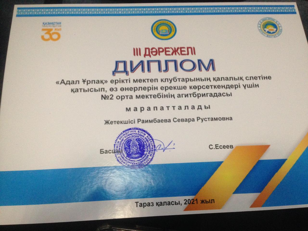 СШ №2 » Оқушыларға » Оқушылар жетістіктері » Поздравляем клуб"Адал Урпак" с 3 местом в городском конкурсе клубов "Адал Ұрпақ " в номинации"Лучшая агитбригада".