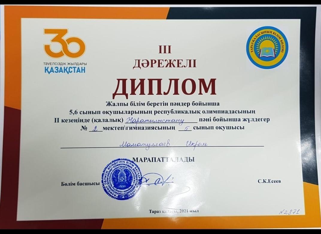 СШ №2 » Оқушыларға » Оқушылар жетістіктері » Поздравляем Маматуллаева Икрома,учащегося 5 класса,занявшего 3 место в городской олимпиаде по естествознанию, которого подготовила учитель химии Узуналиева Г.Б