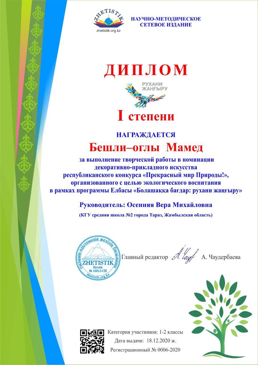 Диплом I степени, Бешли - оглы Мамед » СШ №2