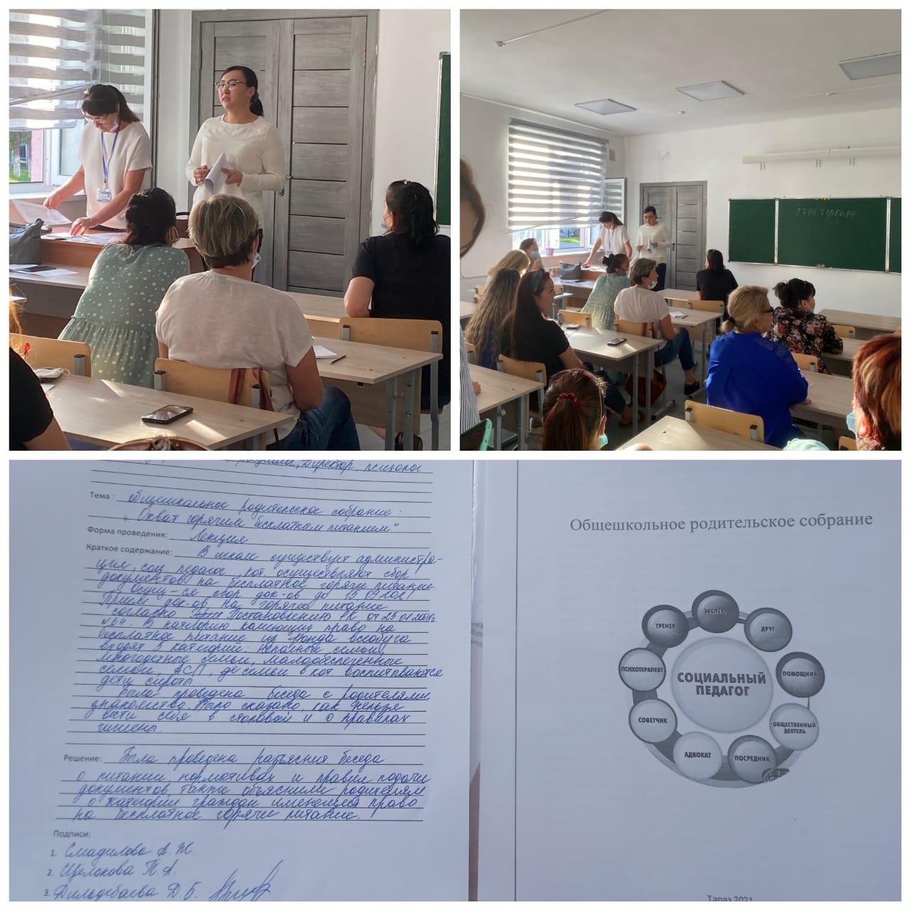 В целях знакомства и разъяснительной работы, администрацией, было организовано общешкольное родительское собрание. В ходе собрания, социолог Дильдебаева Д.Б. прочла лекцию об организации горячего питания из Фонда всеобуча, о правовых нормативах, о приеме и сдаче документов на горячее питание, категорий семей имеющих право на питание из Фонда всеобуча и о гигиене детей.